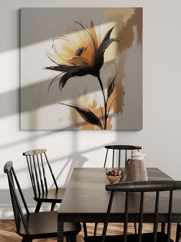 Een elegante, tijdloze bloem uitgevoerd in warme beige tinten met sterke zwarte accenten. De zachte penseelstructuren en luxe contrasten maken dit tot een modern kunstwerk dat rust én stijl toevoegt aan elke ruimte.