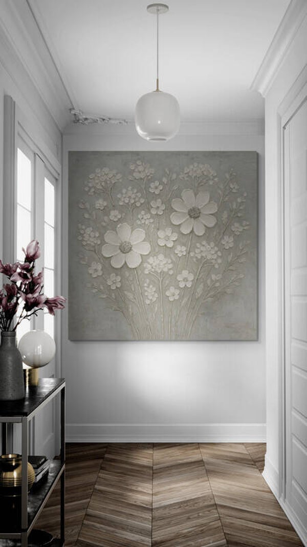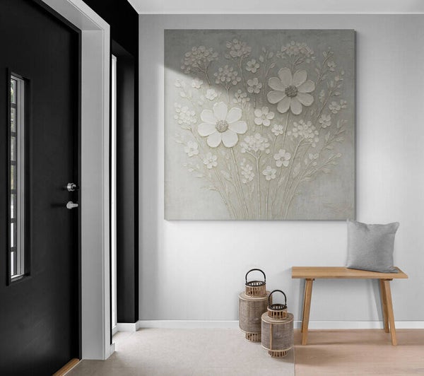 Een zacht en verfijnd reliëfschilderij met een boeket van kleine en grote bloemen, opgewerkt in een lichte kleistructuur. De rustige tinten en subtiele textuur geven dit kunstwerk een serene, elegante uitstraling die perfect past in een modern of landelijk interieur.