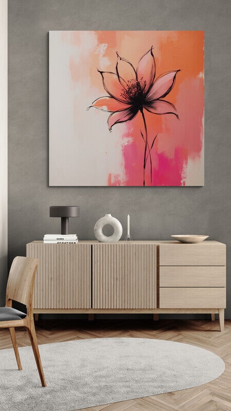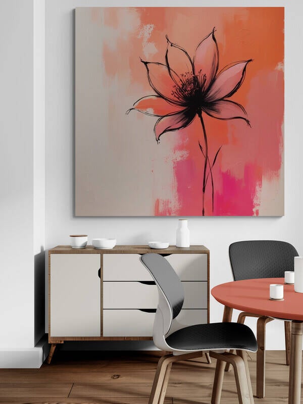 Een elegante, moderne bloem met dynamische lijnen tegen een achtergrond van koraal, roze en zachte perziktinten. De combinatie van expressieve penseelstreken en minimalistische details geeft dit kunstwerk een stijlvolle, warme uitstraling. Perfect voor een modern, vrouwelijk of hotel chic interieur.