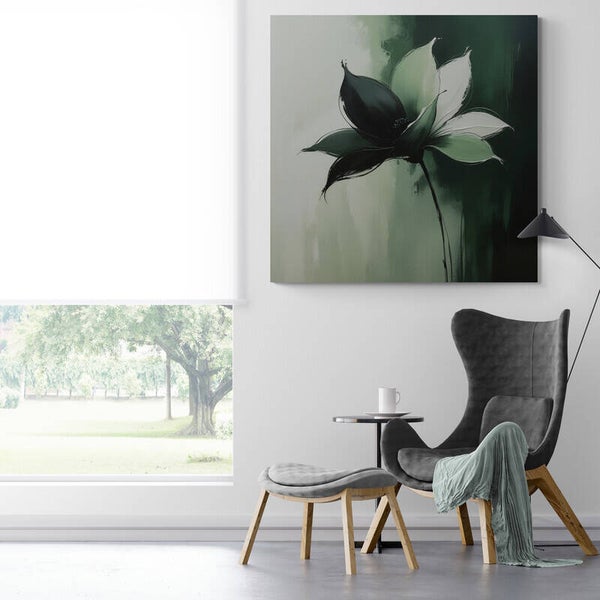 Nightshade Bloom is een modern bloemenschilderij waarin diepe groentinten en zachte lichtaccenten elkaar versterken. De bloem heeft een krachtige, elegante vorm met zwarte contouren die het geheel een minimalistisch en stijlvol karakter geven. Perfect voor een rustige woonkamer, een modern interieur of een sfeervolle slaapkamer.