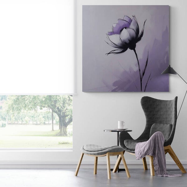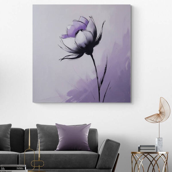 Soft Lavender Bloom is een elegant bloemenschilderij met zachte paarstinten en een minimalistische vormgeving. De bloem heeft vloeiende lijnen en een rustige uitstraling, waardoor het kunstwerk perfect past in een modern interieur, slaapkamer of een serene woonkamer. De combinatie van lila, wit en zwart geeft dit werk een verfijnde, stijlvolle uitstraling.