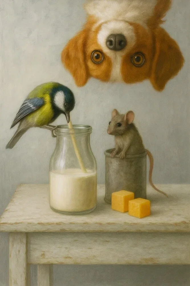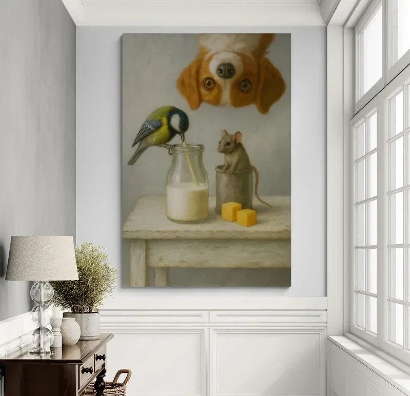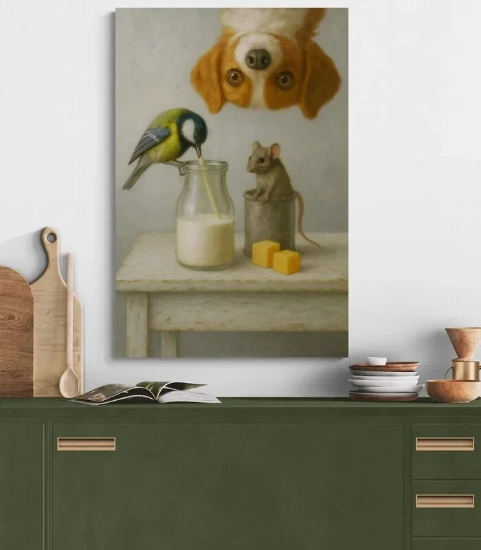 Dit kunstwerk toont een speels en warm tafereel in een lichte, kalkwitte vintage stijl. Een koolmees drinkt nieuwsgierig uit een melkfles, terwijl een klein muisje vanaf een verweerd blikje meekijkt. Bovenaan kijkt een hond met grote, vriendelijke ogen naar het tafereel, waardoor het geheel een vrolijke en charmante uitstraling krijgt. De kalkwitte, licht verweerde tafel en de subtiele vintage structuur in de achtergrond geven het schilderij een rustige en zachte sfeer. Deze Kalkwitte Editie is de lichte, moderne variant van het originele Ochtendgasten en past perfect in Scandinavische, landelijke en rustige interieurs.