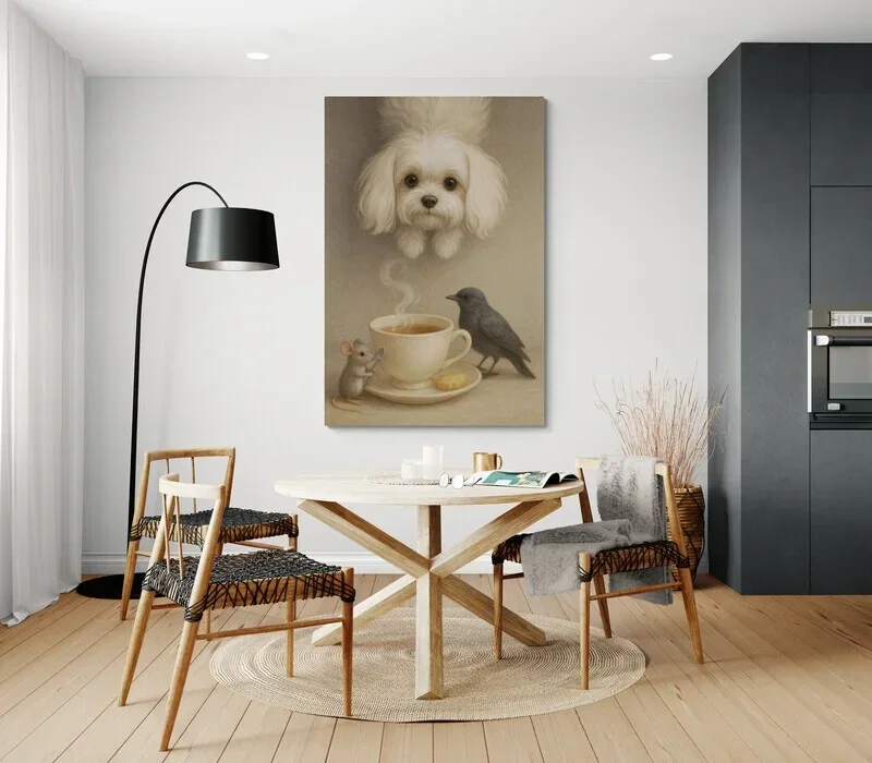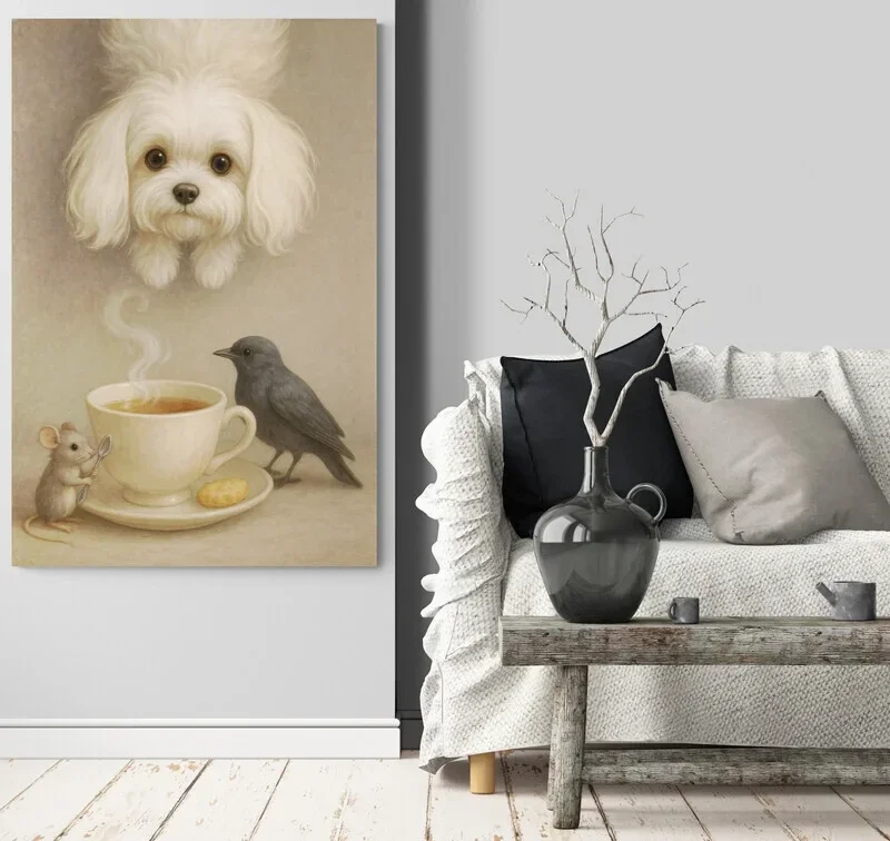 Tea Companions is een warm en verfijnd dierenschilderij met een rustige vintage uitstraling. Het kunstwerk toont een Maltezer hondje dat nieuwsgierig naar beneden kijkt, terwijl een kleine muis en een donkergrijze vogel samen rondom een kop dampende thee zijn geplaatst. De zachte kleuren en de subtiel verouderde achtergrond geven het geheel een nostalgische, klassieke sfeer. Het is een uniek en sfeervol kunstwerk dat perfect past in een landelijke, romantische of vintage ingerichte ruimte.