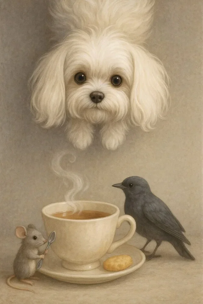 Maltezer hondje, klein vogeltje, muis met lepel, grote theekop, zachte vintage achtergrond, nostalgische compositie, rustige texturen