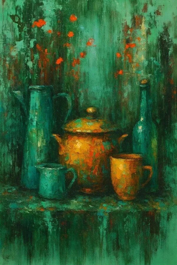 Een sfeervol abstract schilderij van keukengebruik met een kunstzinnige compositie van potten, kannen en flessen in warme oker- en turquoise tinten. De rijke texturen en kleurcontrasten zorgen voor een warme en artistieke uitstraling aan de muur.
