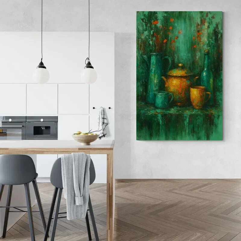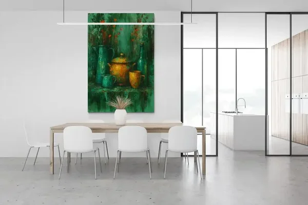 In dit abstracte keuken schilderij komen kleur, vorm en structuur harmonieus samen. De okergele potten en oranjegouden accenten steken levendig af tegen de verweerde turquoise achtergrond. Het penseelgebruik is expressief, met zichtbare verticale en diagonale streekbewegingen die de achtergrond diepte geven. Subtiele rode vegen in de bovenhelft geven het geheel een levendige, bijna bloemachtige dynamiek. Ideaal als stijlvolle wanddecoratie in een keuken, eethoek of bistro met karakter.