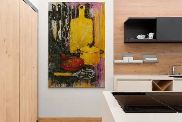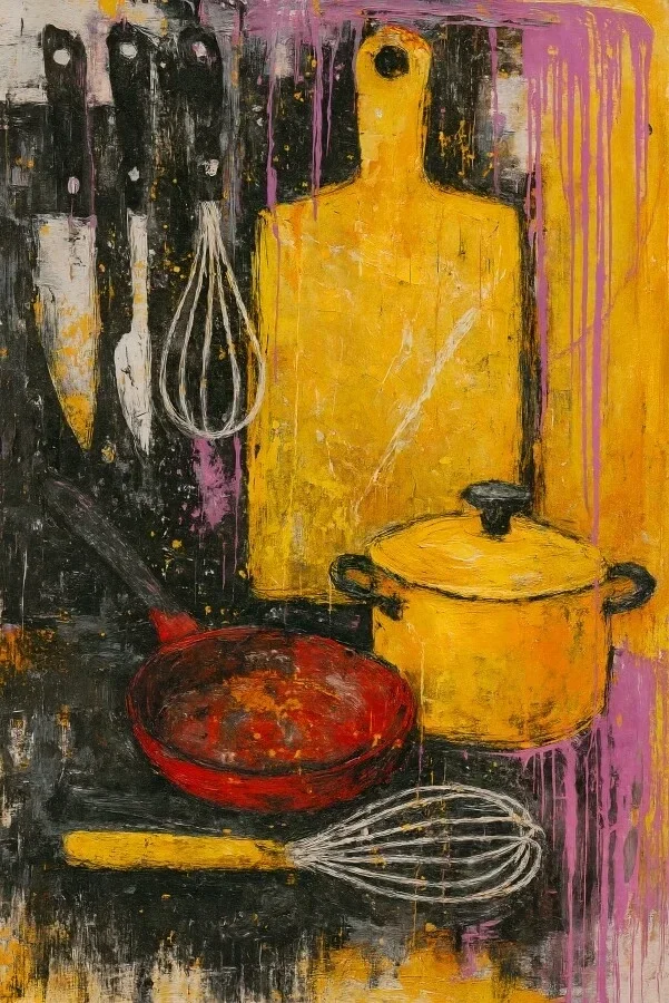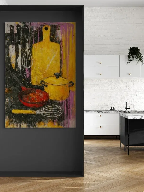 Een dynamisch schilderij vol kleur en textuur, waarin klassieke keukenobjecten zoals messen, een garde, snijplank en pannen zijn vastgelegd in een stoere, abstracte compositie. Dit werk geeft een creatieve twist aan je keukenmuur.