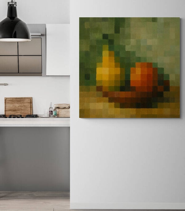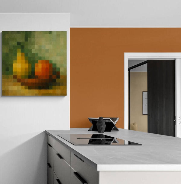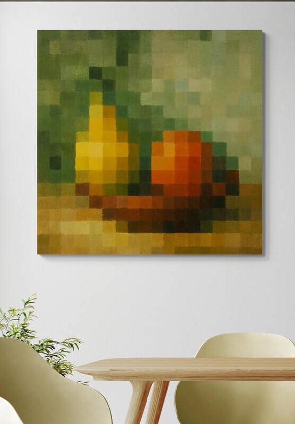 Een moderne en kunstzinnige fruitcompositie opgebouwd uit grote pixelvlakken. De perenvorm en de warme kleuren worden zichtbaar door de herkenbare pixelstructuur, waardoor het geheel een schilderachtige uitstraling krijgt. De combinatie van pixelkunst en zachte verfachtige texturen maakt dit werk bijzonder geschikt voor moderne, kleurrijke en minimalistische interieurs.