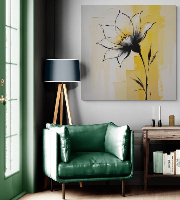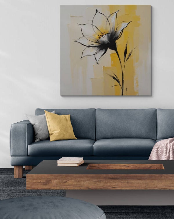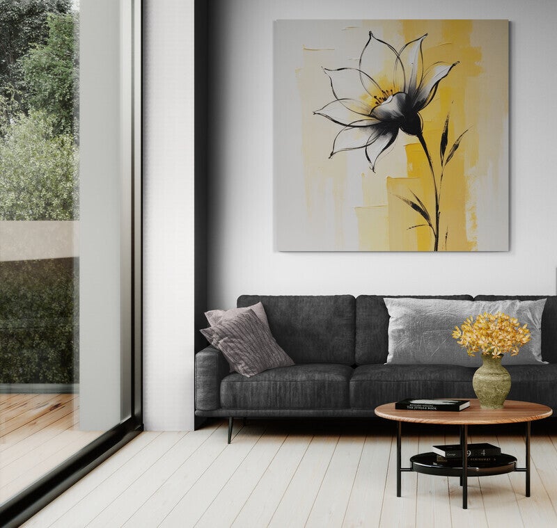 Een moderne en kunstzinnige bloem weergegeven in losse, expressieve penseelstreken met warme gele tinten en elegante zwarte contouren. De bloem lijkt bijna te zweven tegen een zachte, geschilderde achtergrond, waardoor het werk een lichte, verfijnde en sfeervolle uitstraling krijgt. Een stijlvol kunstwerk dat rust, warmte en verfijning toevoegt aan elke kamer.