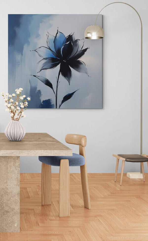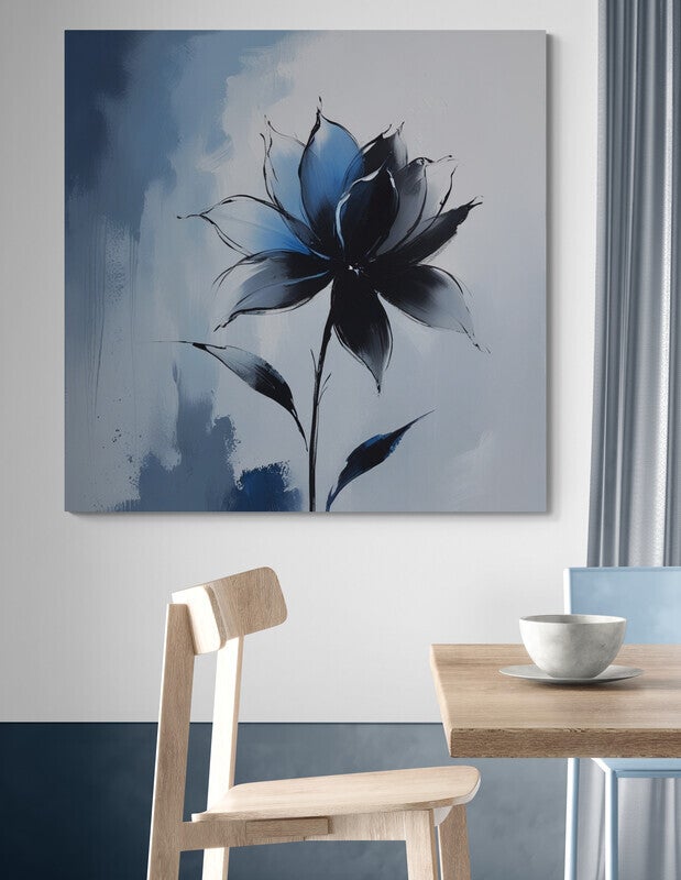Een moderne en rustige voorstelling van een abstracte bloem in diepe en lichte blauwtinten. De combinatie van vloeiende lijnen en verfachtige structuren geeft het werk een zachte, artistieke uitstraling. De donkere bloemvorm staat mooi in contrast met de frisse witte en blauwe achtergrond, waardoor het geheel elegant en verfijnd oogt.