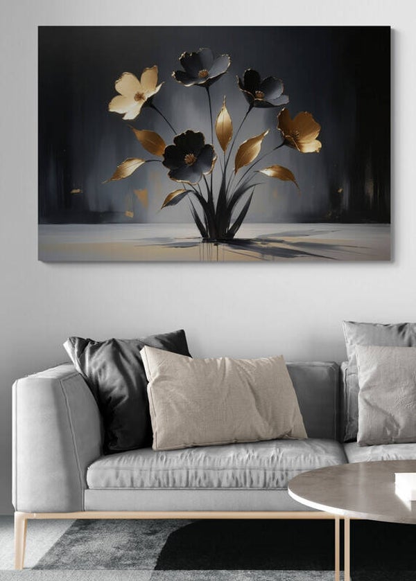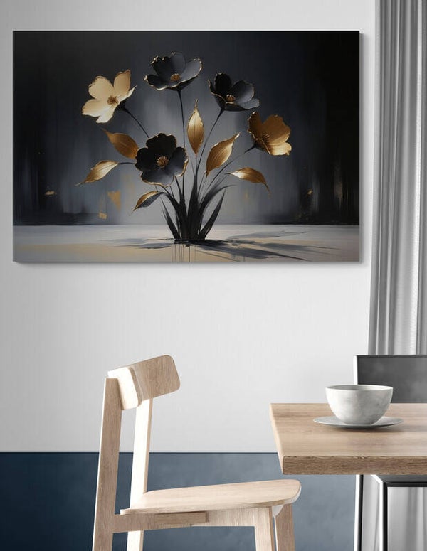 Een luxe en stijlvol bloemenkunstwerk in zwart en goud, met een glanzende afwerking die direct een hotel chic uitstraling geeft. De gouden bladeren en bloemaccenten lichten prachtig op tegen de diepe donkere achtergrond, waardoor het geheel een elegante en moderne sfeer krijgt. Dit schilderij past perfect in interieurs die luxe, warmte en verfijning willen uitstralen.