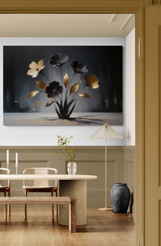 Goudlicht Bloemen – luxe zwart-goud schilderij in hotel chic stijl