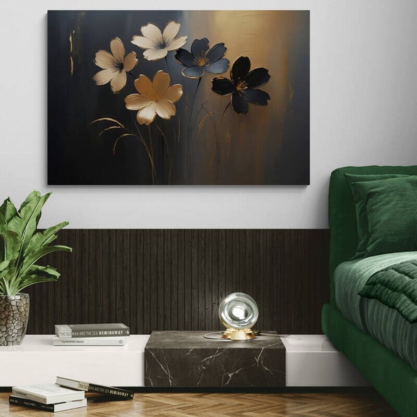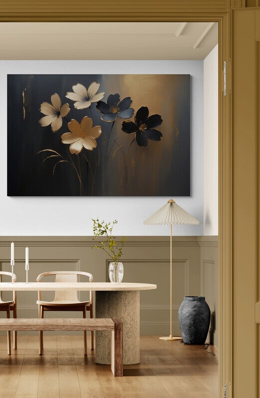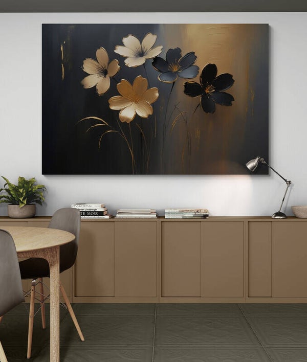 Een stijlvol en luxe bloemenschilderij waarin zwarte en gouden bloemblaadjes samen een elegante compositie vormen. De glanzende gouden accenten geven het kunstwerk een chic hotelgevoel, terwijl de donkere achtergrond zorgt voor diepte en een moderne, sfeervolle uitstraling. Een perfecte eyecatcher voor liefhebbers van luxe wanddecoratie.