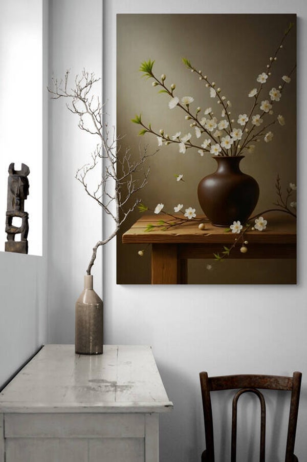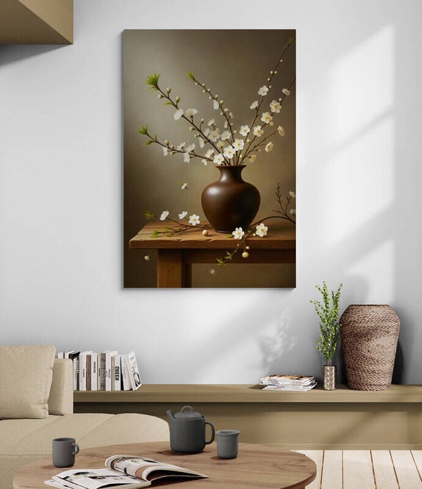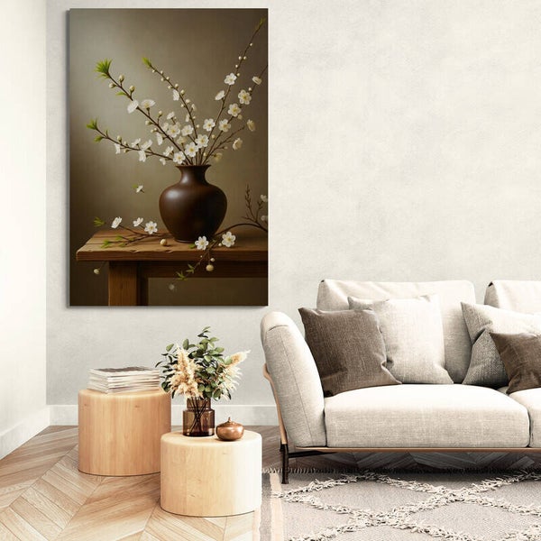 Een verstild moment in beeld: dit schilderij toont een elegante compositie van witte bloesemtakken in een donkere vaas, geplaatst op een robuuste houten tafel. De zachte achtergrond en natuurlijke tinten geven dit kunstwerk een kalme en stijlvolle uitstraling. Ideaal voor interieurs die verlangen naar eenvoud, natuur en verfijning aan de muur.