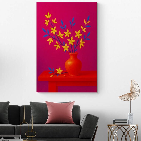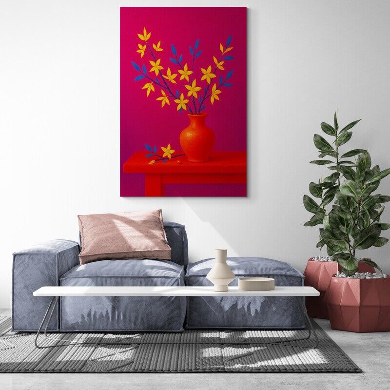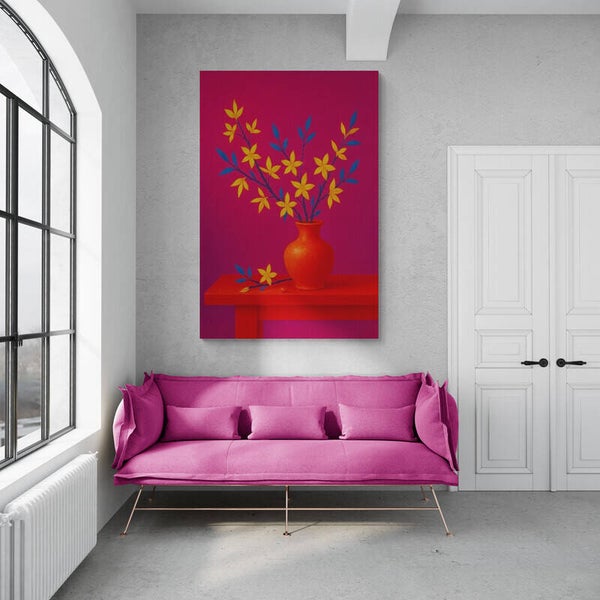 Een explosie van kleur en energie: dit schilderij brengt een fel oranje vaas samen met helder gele bloemen en diepblauwe bladeren, tegen een intens roze achtergrond. De kleuren springen van de muur en geven elk interieur een levendige, moderne twist. Een echt statement piece voor wie van durf, contrast en stijl houdt.