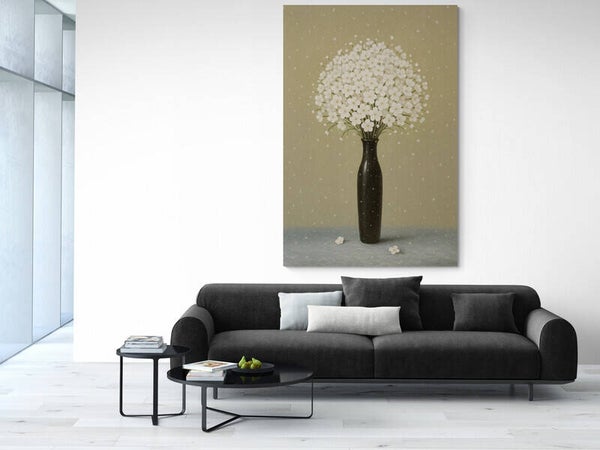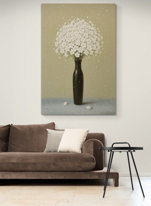Een ingetogen kunstwerk waarin rust en verfijning samenkomen. Een hoge, donkere vaas met een wolk van witte bloemen staat centraal tegen een zachte beige achtergrond met subtiele stipstructuur. Elk bloemetje lijkt te zweven in de lucht, als fijne vlokken of herinneringen. De licht korrelige textuur geeft het werk een tactiele zachtheid, alsof het op fijn papier of fluweel geschilderd is. Voor liefhebbers van kalmte, licht en pure vormen aan de muur.