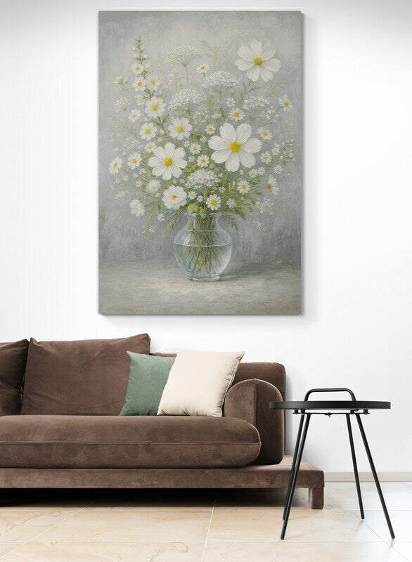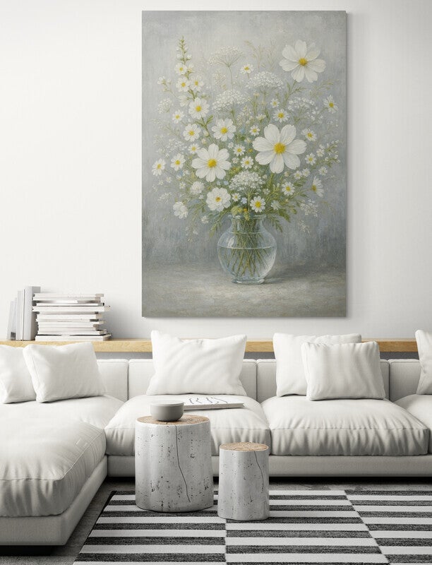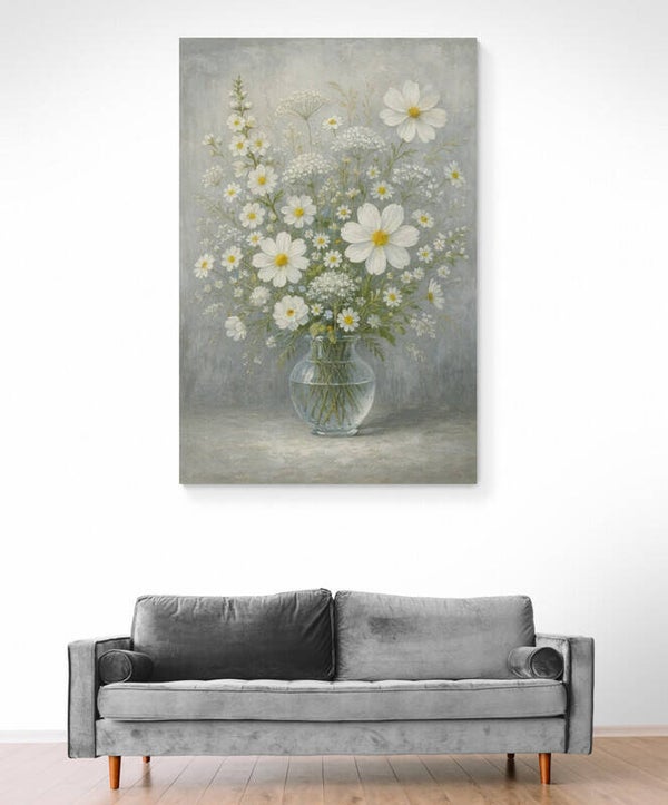 Een licht en verfijnd bloemenschilderij met witte margrieten en veldbloemen in een transparante glazen vaas. De zichtbare penseelstructuur en poederige, grijsblauwe achtergrond geven dit kunstwerk de uitstraling van een klassiek schilderij in landelijke stijl. De bloemen zijn luchtig geschikt en lijken zo uit een Franse tuin geplukt. Perfect voor wie houdt van rust, natuur en een zachte, landelijke sfeer aan de muur.