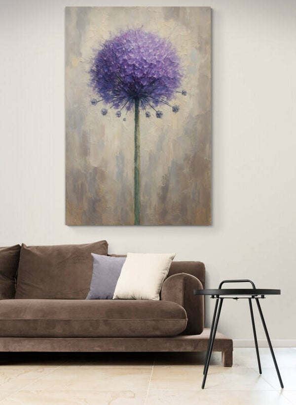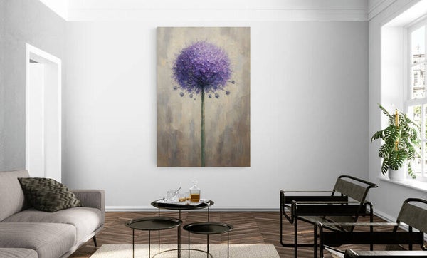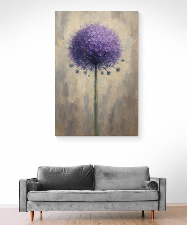 Een zacht en rustgevend schilderij van een paarse allium, realistisch uitgewerkt met een verfachtige textuur. De lange steel en de ronde bloemkop geven het werk een elegante, statige uitstraling. De achtergrond bestaat uit verouderde beige- en grijstonen, waardoor het geheel een rustige en warme sfeer krijgt. Perfect voor liefhebbers van natuurlijke kunst met een tijdloze uitstraling.