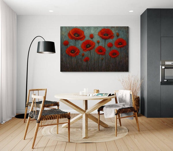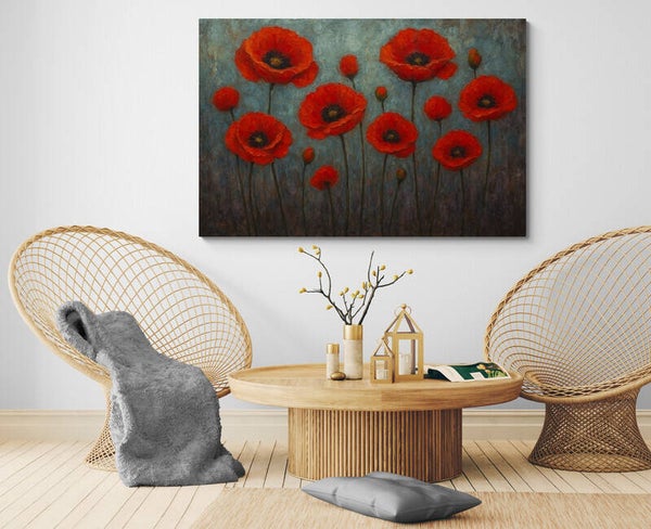 Een sfeervol en karaktervol schilderij van helderrode klaprozen die sterk afsteken tegen een rijke blauwgrijze achtergrond. De textuur is mooi zichtbaar in het schilderwerk, waardoor de bloemen diepte en warmte krijgen. De combinatie van diepe roodtinten, olijfgroene stelen en een koele, bijna mistige achtergrond geeft dit kunstwerk een krachtige maar toch rustgevende uitstraling. Perfect voor een woonkamer, hal of slaapkamer waar je een vleugje natuur en elegantie wilt binnenbrengen.