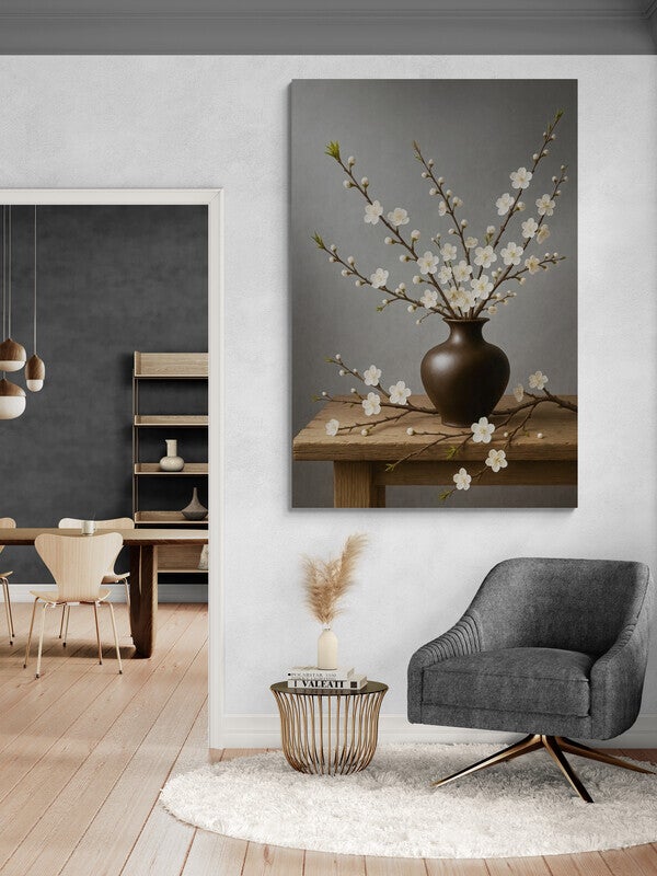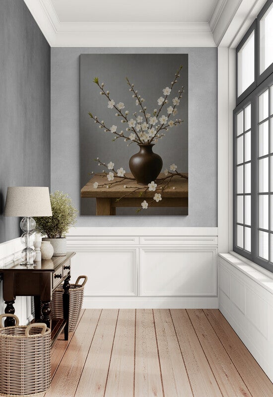 Een krachtig en toch verfijnd schilderij waarin witte bloesemtakken sierlijk uit een donkere aardewerken vaas omhoog komen. De grove houtstructuur van de tafel en de matte grijze achtergrond geven dit werk een stoer, landelijk en natuurlijk karakter. De zachte bloesems steken prachtig af tegen het rustige kleurpalet, waardoor het geheel warm, puur en tijdloos aanvoelt. Dit schilderij brengt een rustige, rustieke sfeer in zowel moderne als landelijke interieurs.