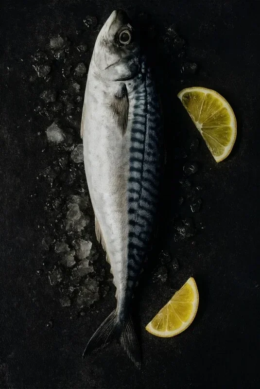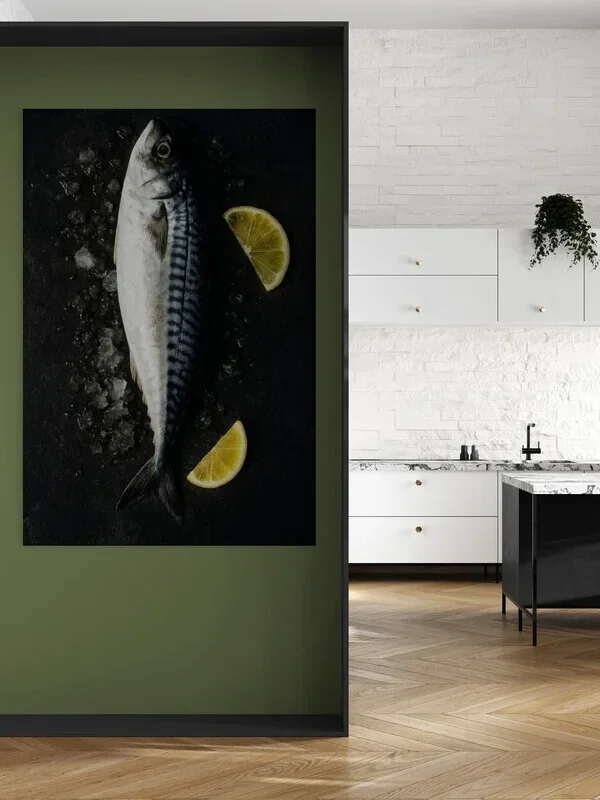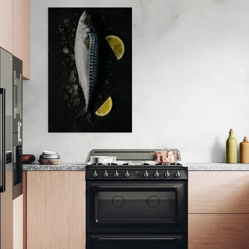 Realistisch schilderij van een makreel op een donkere achtergrond met ijsblokjes en twee partjes citroen. De contrasterende kleuren en strakke compositie maken het een stijlvolle toevoeging aan moderne keukens, culinaire werkruimtes of restaurants met een eigentijdse uitstraling.