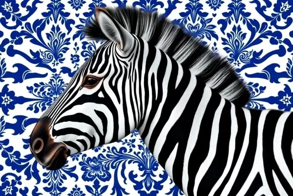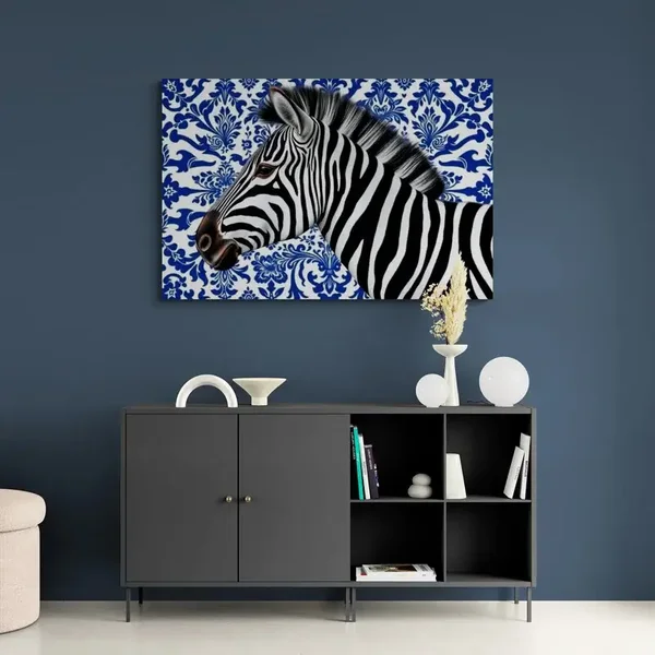 Dit kunstwerk combineert de stoere uitstraling van een zebra met de verfijnde elegantie van Delfts blauw. De zwart-witte strepen van de zebra contrasteren prachtig met het klassieke blauwe patroon op de achtergrond, waardoor er een verrassend en eigentijds geheel ontstaat.