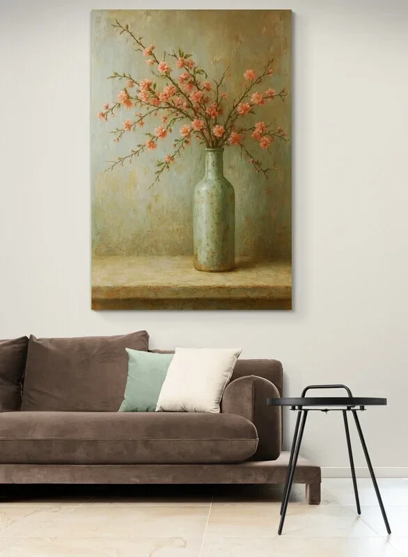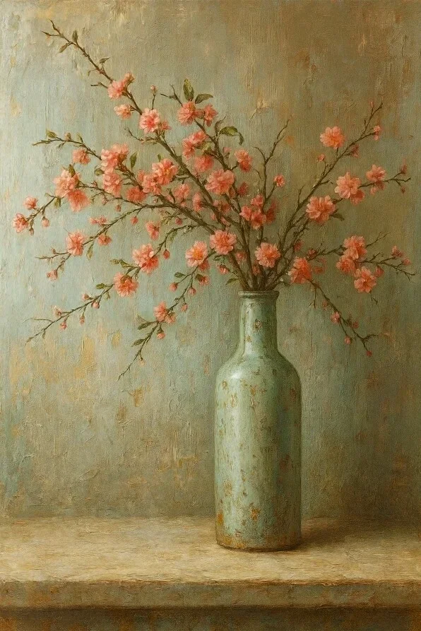 Een warm en rustgevend kunstwerk dat doet denken aan een oud stilleven in een Franse boerderij. Zachtroze bloesemtakken spreiden zich sierlijk uit vanuit een verweerde, groenblauwe vaas op een stenen blad. De achtergrond heeft een poederige, verweerde textuur die het werk diepte en karakter geeft. Dit schilderij ademt landelijke eenvoud en past prachtig in natuurlijke interieurs of rustieke ruimtes.