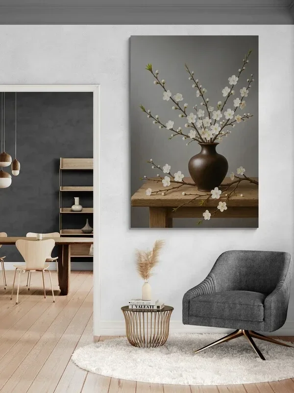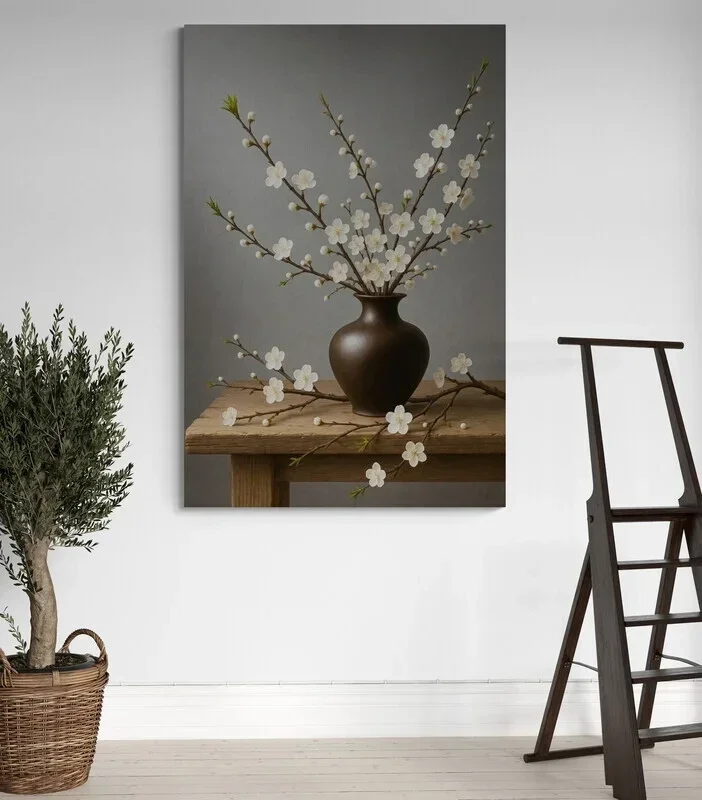 Een krachtig en toch verfijnd schilderij waarin witte bloesemtakken sierlijk uit een donkere aardewerken vaas omhoog komen. De grove houtstructuur van de tafel en de matte grijze achtergrond geven dit werk een stoer, landelijk en natuurlijk karakter. De zachte bloesems steken prachtig af tegen het rustige kleurpalet, waardoor het geheel warm, puur en tijdloos aanvoelt. Dit schilderij brengt een rustige, rustieke sfeer in zowel moderne als landelijke interieurs.