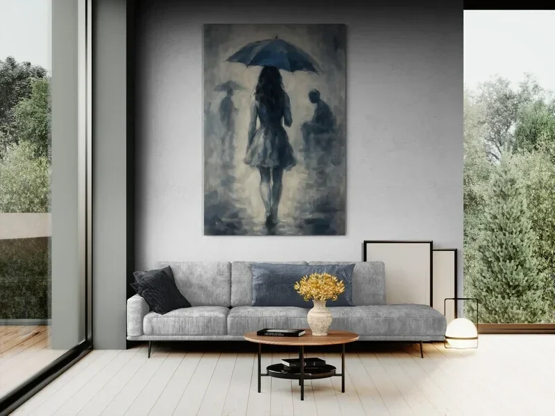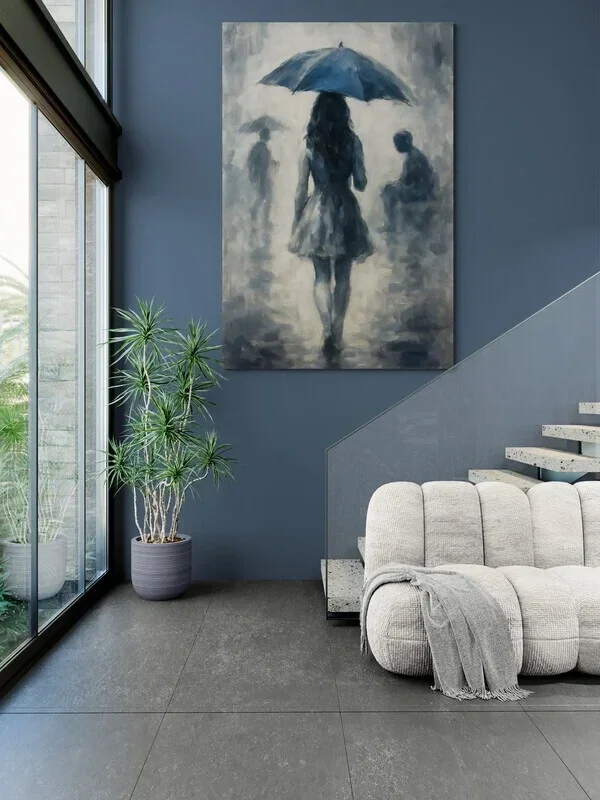 Een sfeervol impressionistisch schilderij van een vrouw die door de regen loopt met een blauwe paraplu. De zachte penseelstreken en het mysterieuze spel van licht en schaduw creëren een poëtische en dromerige sfeer. Dit kunstwerk brengt rust, melancholie en elegantie in elk interieur.