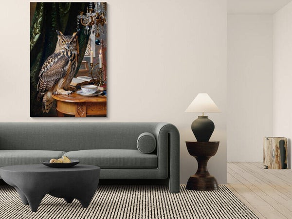 Wachter van de Wijsheid – schilderij uil aan tafel in klassiek interieur