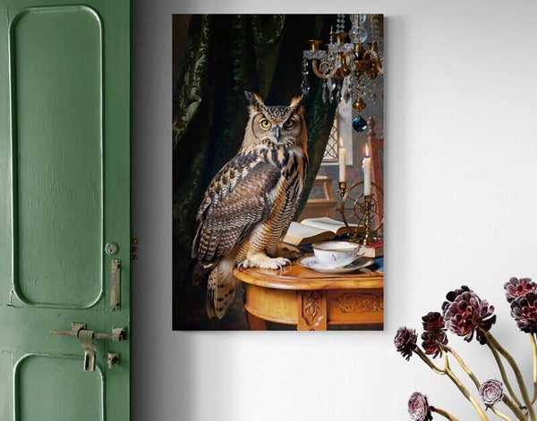 Een indrukwekkend kunstwerk vol symboliek en sfeer. Een majestueuze uil rust op een klassieke houten tafel, omringd door boeken, kaarslicht en een kopje porselein. De setting ademt kennis, mystiek en een vleugje magie – perfect voor liefhebbers van dierenportretten en sfeervolle wanddecoratie.