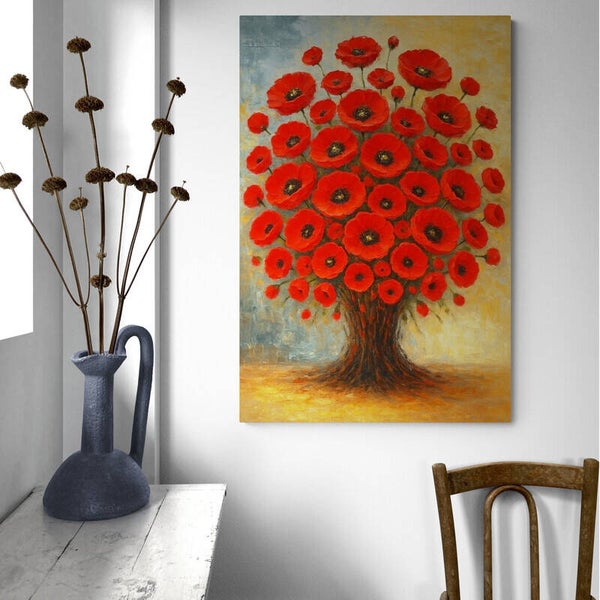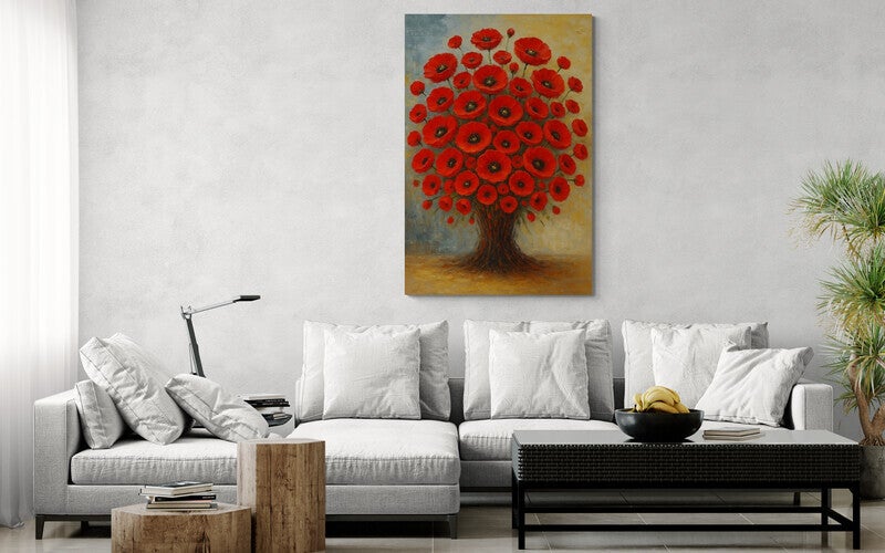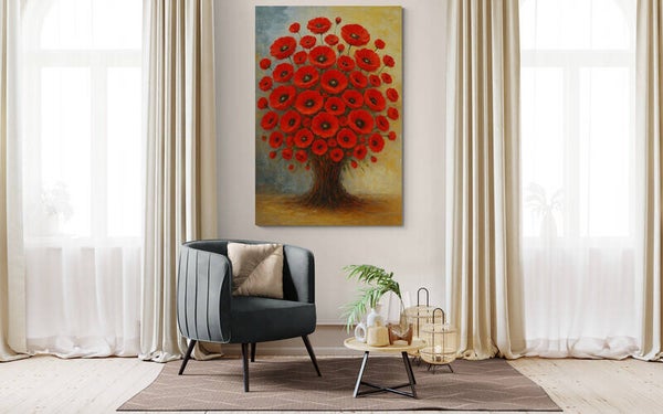 Een fantasierijk kunstwerk waarin bloemen en bomen samensmelten tot één levendig geheel. Rode klaprozen bloeien in volle pracht vanuit een boomvormige stam, alsof de natuur zelf een ode brengt aan groei en levenslust. De achtergrond verloopt van een warme okergele gloed naar koel blauwgrijs, met zichtbare penseelstreken die het schilderij extra textuur en diepte geven. Een opvallend werk dat vreugde, energie en symboliek in je interieur brengt.