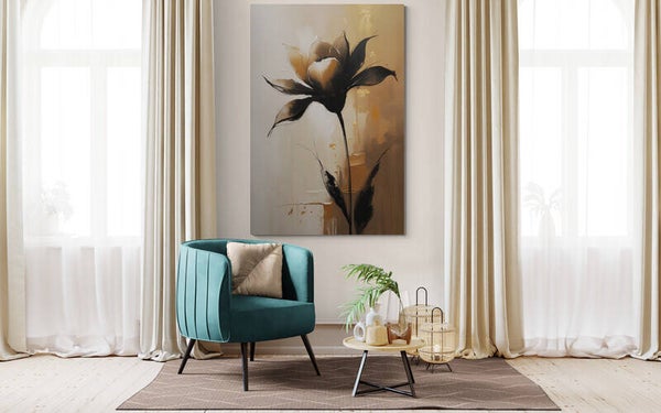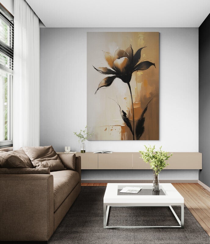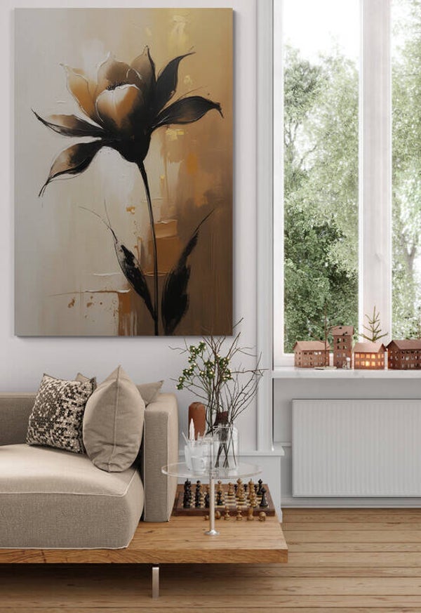Een minimalistisch bloemportret dat rust en verfijning uitstraalt. Deze gestileerde bloem ontvouwt zich in zwart en goudbruine penseelstreken tegen een warme achtergrond van beige tot brons, met subtiele textuur en een paar abstracte goudaccenten. De compositie is strak maar gevoelig, perfect voor een modern interieur met natuurlijke tinten. Een krachtig werk dat met weinig lijnen veel zegt.