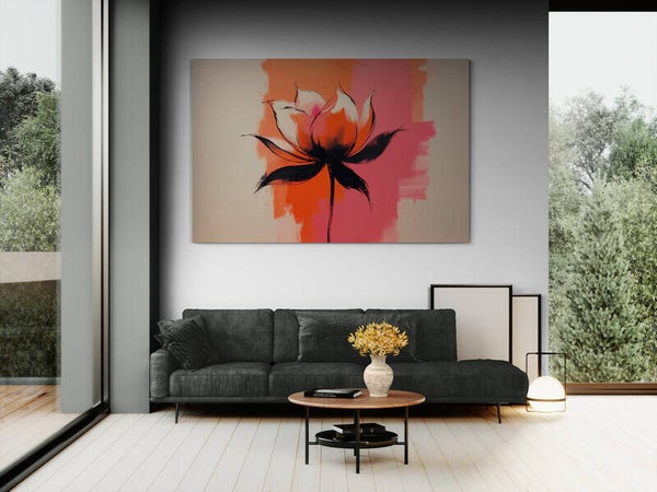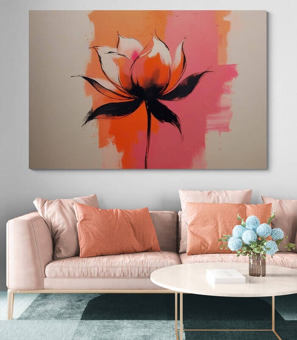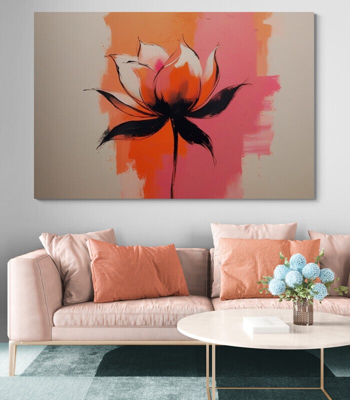 Een expressief schilderij van een lotusbloem in volle bloei, geschilderd in warme roze- en oranjetinten met diepe zwarte accenten. De achtergrond is speels en modern opgebouwd: centraal felle vuurkleuren, naar buiten toe zacht uitgewaaierd in een lichte crème ondergrond. Hierdoor lijkt de bloem te zweven in het licht. Een abstract bloemenschilderij dat kracht en rust combineert – ideaal voor een modern interieur met lef én balans.