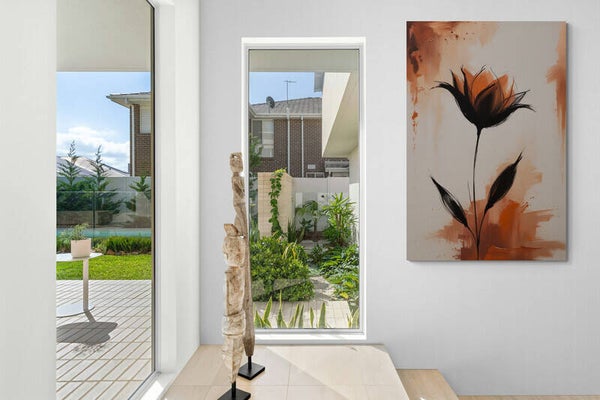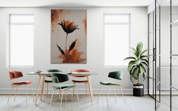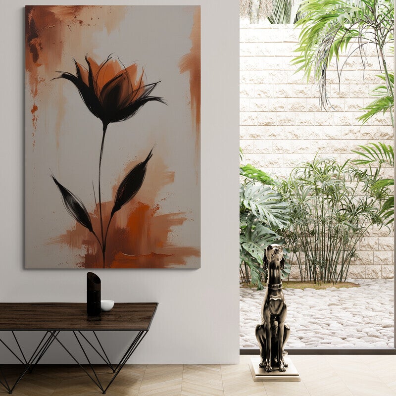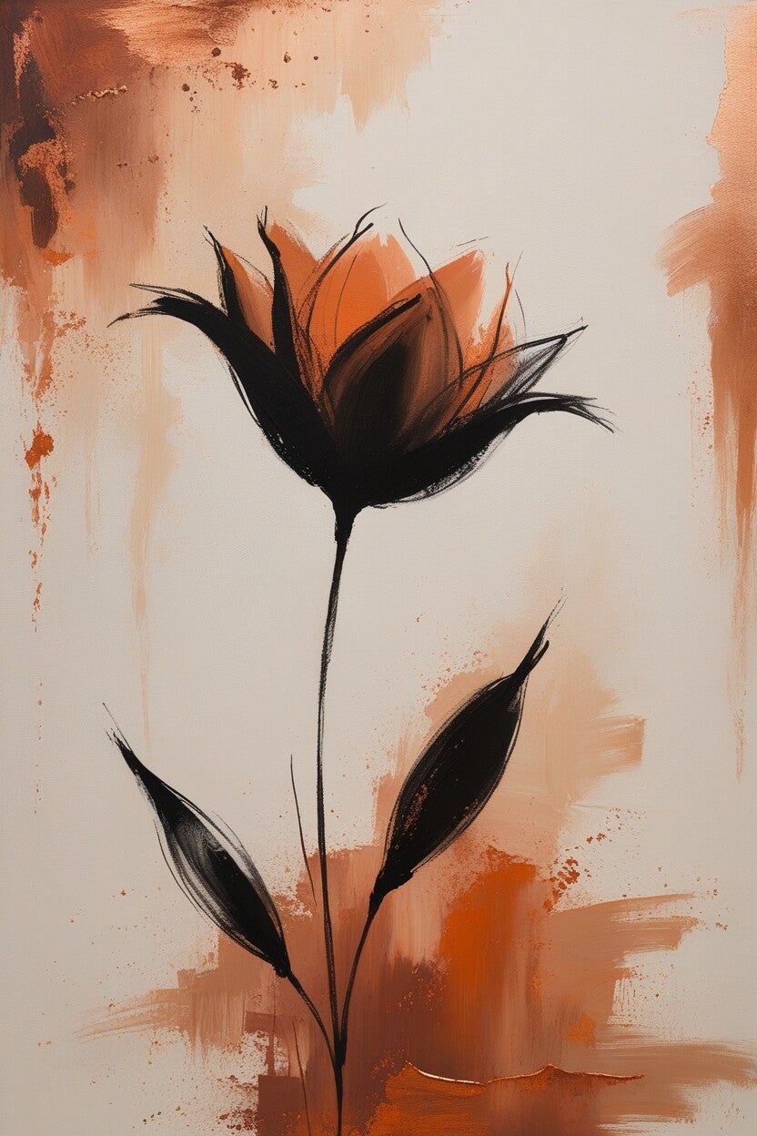Een krachtige bloem met diepe zwarte lijnen en warme kopertinten straalt vanuit dit moderne kunstwerk. De lotusbloem lijkt op te lichten tegen een achtergrond van beige en roestachtig oranje, met spetters en penseelstructuur die beweging en expressie toevoegen. Een abstract schilderij dat warmte, kracht en natuurlijke elegantie samenbrengt. Perfect voor interieurs met aardetinten of een modern industrieel accent.