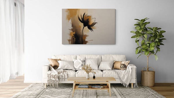 Een bloem in beweging, gevangen in zwarte penseelstreken met subtiele goudaccenten. De warme beige achtergrond straalt licht uit, terwijl het zwart de vorm kracht en ritme geeft. De gouden toets maakt het schilderij levendig, zonder schreeuwerig te worden. Een sfeervol werk dat warmte en elegantie toevoegt aan een modern of natuurlijk interieur.