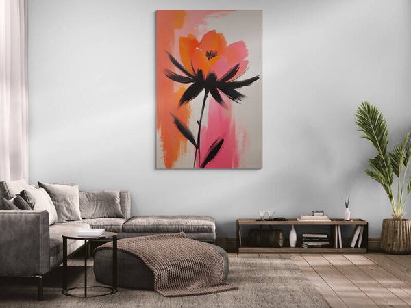 Een bloem als zonnestraal, fel en onverschrokken. De combinatie van helder oranje en neonroze blaadjes met diepe zwarte accenten zorgt voor een expressieve uitstraling vol energie. De achtergrond in zachte koraaltinten houdt het geheel licht, waardoor het kunstwerk in elke ruimte als blikvanger werkt – speels, modern en uitgesproken.