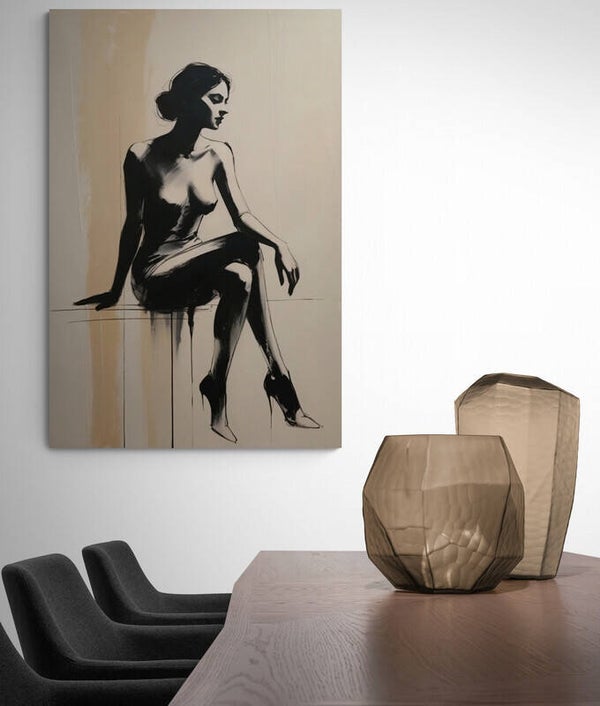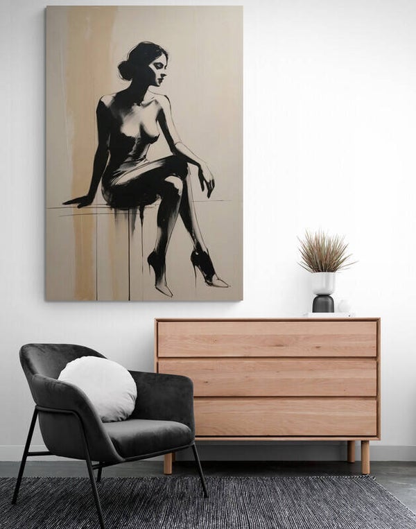 Een vrouw gevangen in een moment van stilte en elegantie. Naadlicht toont een krachtig vrouwelijk silhouet in zwarte penseelstreken, subtiel afgetekend tegen een warme zandwitte achtergrond. De houding is sierlijk, met de benen gekruist en het hoofd in zachte contemplatie. Een modern kunstwerk dat de grens tussen figuratief en abstract laat vervagen – stijlvol, tijdloos en met karakter.