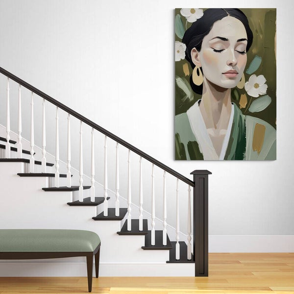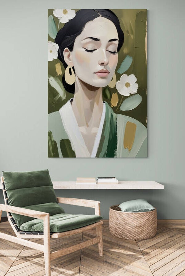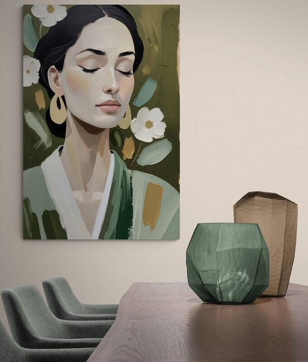 Een portret dat niet schreeuwt, maar fluistert. Stilgroei toont een vrouw met gesloten ogen, gevangen in een moment van volledige rust. De penseelstreken zijn stevig, de kleuren zacht en natuurlijk. Groentinten, goud en crème vloeien harmonieus samen tot een modern en sereen geheel. Dit kunstwerk straalt innerlijke balans en verfijning uit – perfect voor een ruimte waar stijl en rust samenkomen.