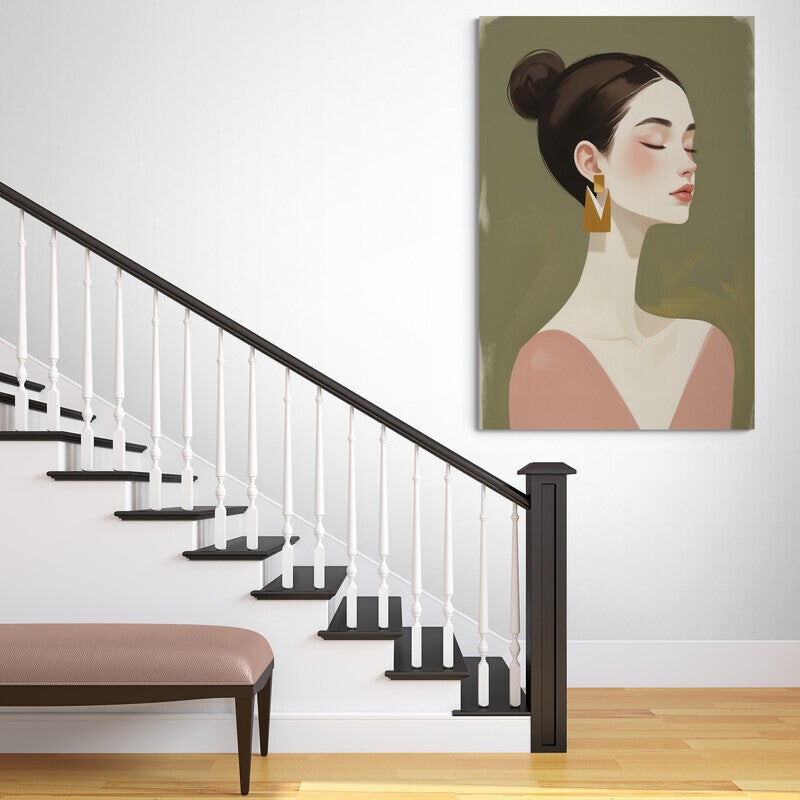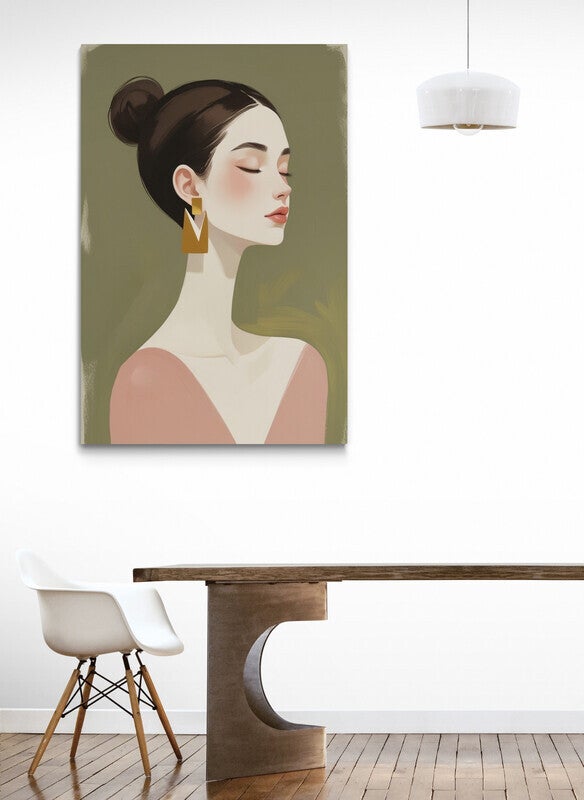 Een portret met een tijdloze eenvoud. Veldlijn toont een vrouw in zijaanzicht, haar ogen gesloten, haar uitstraling kalm en krachtig. De achtergrond in mosgroen contrasteert zacht met haar huid en de matte roze jurk. De goudkleurige oorbel voegt een strak designaccent toe. Dit moderne schilderij brengt rust, esthetiek en karakter in één beeld samen.