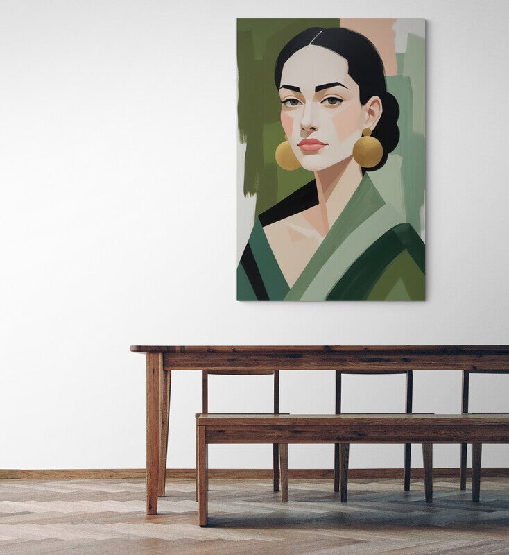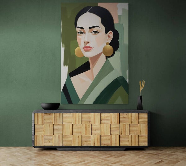 Opvallend portret van een vrouw met een intense blik en karaktervolle uitstraling. De abstract geschilderde vormen in zachte huidtonen en krachtige groene vlakken maken dit werk modern en stijlvol. Haar grote gouden oorbellen vangen direct het licht, waardoor dit kunstwerk een elegante blikvanger is in elke ruimte – perfect voor een strak interieur met lef.
