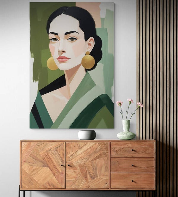 Velez – modern portret schilderij vrouw met gouden oorbellen in groene stijl