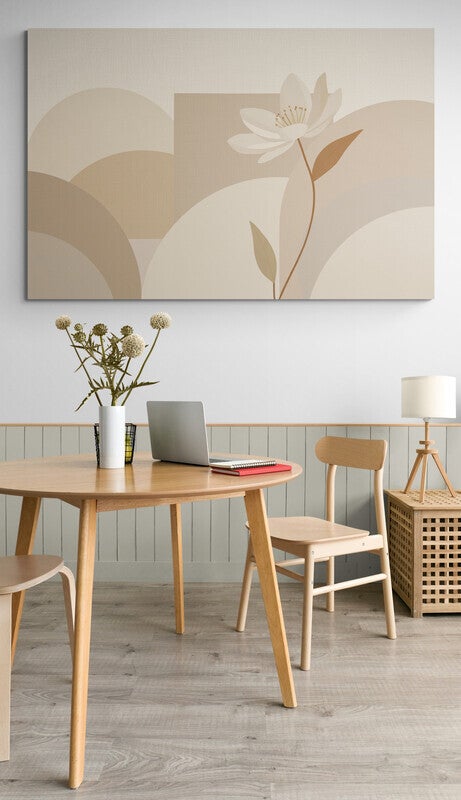 ‘Zijdezacht’ toont een tedere witte bloem die zich opent tegen een achtergrond van golvende vormen in zand- en crèmetinten. De zachte lijnen en de subtiele linnenstructuur zorgen voor een rustgevende sfeer. Ideaal voor interieurs die rust, licht en zachtheid uitstralen.