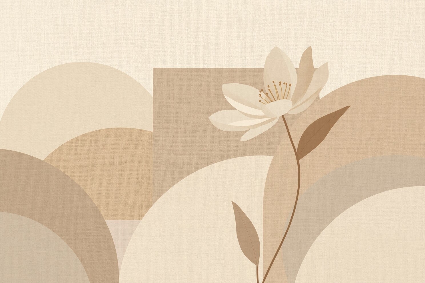 Linnenstructuur, abstracte bloem met open bloemblaadjes, zachte kleurvlakken, ronde vormen, minimalistische stijl