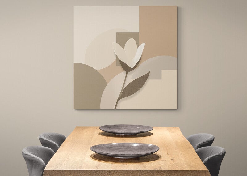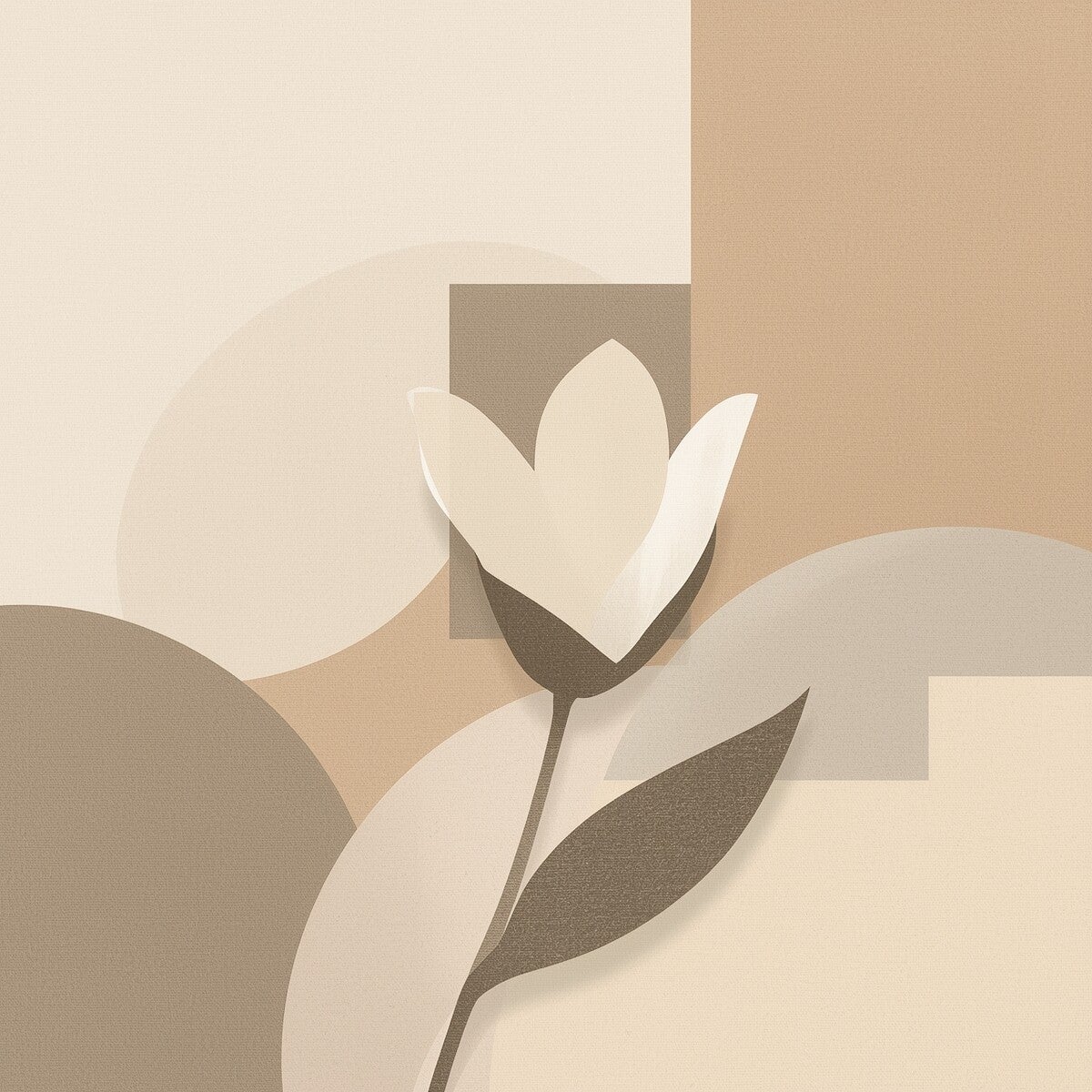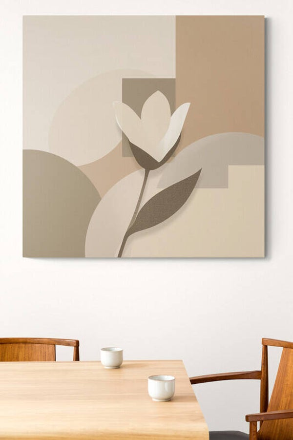 ‘Dageraad’ is een abstract bloem schilderij waarin eenvoud en licht samenkomen. De witte bloem steekt verfijnd af tegen een achtergrond van zachte aardetinten. De linnenstructuur geeft het werk een subtiele textuur, perfect voor serene interieurs.