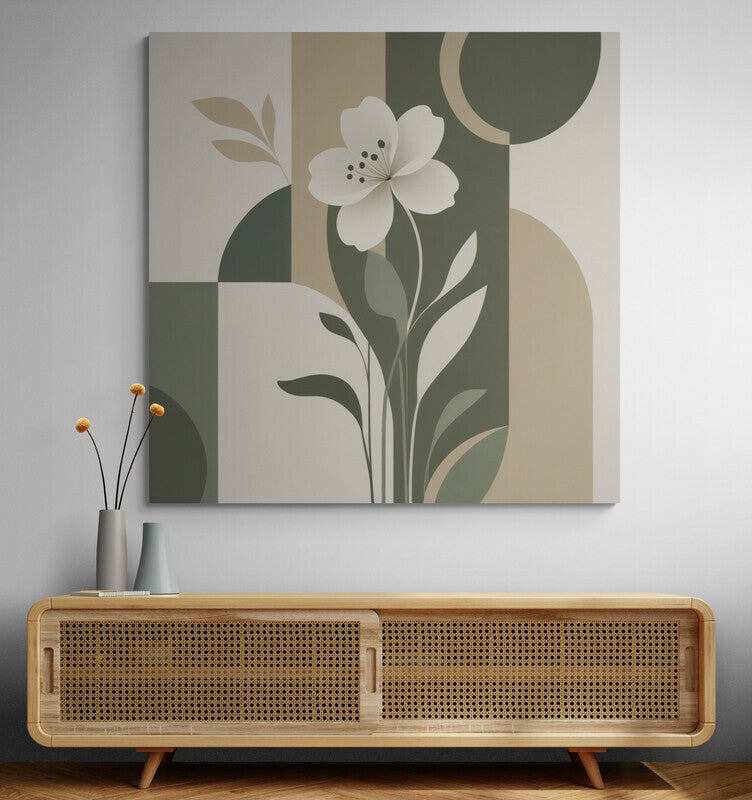 In dit krachtige ontwerp komt een bloem tot leven in gebalanceerde vormen en verfijnde tinten. De afgeronde kleurvlakken creëren ritme en rust, terwijl de bloem naar links gericht is in een subtiele zijlijn. Dankzij de verfstructuur voelt het geheel tastbaar en warm aan – ideaal voor moderne interieurs met een minimalistische of natuurlijke basis.