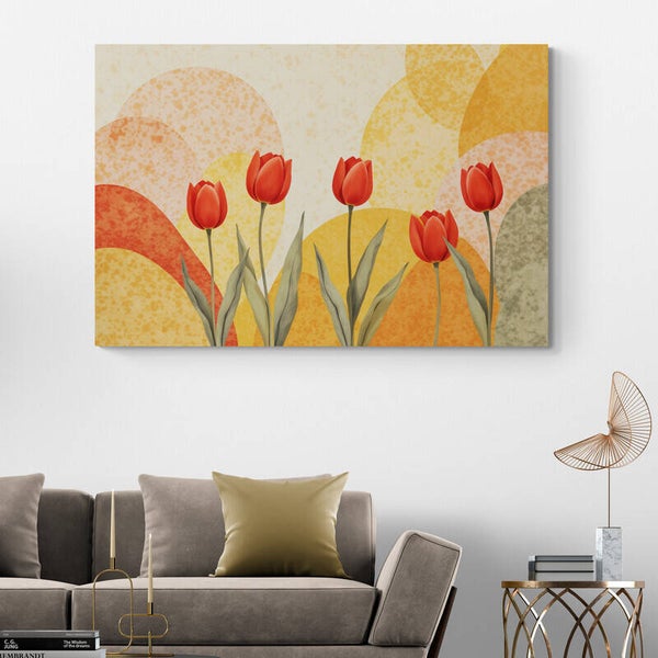 Heldere rode tulpen rijzen op uit een veld van warme retrobogen in oranje, geel en zachte abrikoostinten. De abstracte vormen en zachte textuur geven dit kunstwerk een speelse en zonnige uitstraling. De combinatie van tulpen en kleurvelden maakt dit tot een krachtig, vrolijk statement aan de muur.