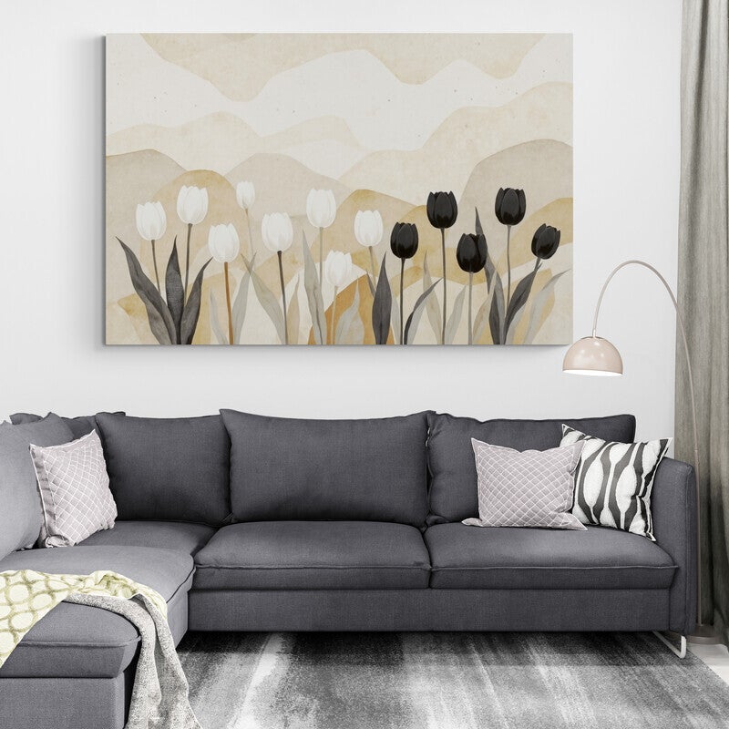 Een ritmisch veld van zwarte en witte tulpen steekt af tegen een zachte, golvende achtergrond van zandtinten en beige vlakken. De waterverfstructuur geeft het geheel een poëtische diepte. De ingetogen kleuren en grafische stijl maken dit kunstwerk geschikt voor zowel minimalistische als warme interieurs.