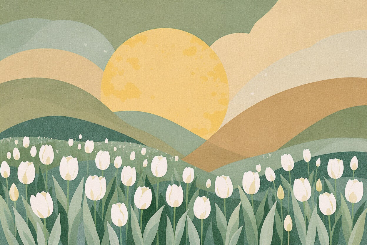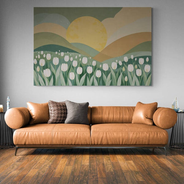 Een sereen landschap met zachte groene heuvels, een warme gele zon en een veld vol lichte tulpen. De matte structuur en natuurlijke kleuren zorgen voor een gevoel van ochtendrust. De abstracte vormen en het verfijnde kleurgebruik maken dit kunstwerk perfect voor een fris, natuurlijk interieur.