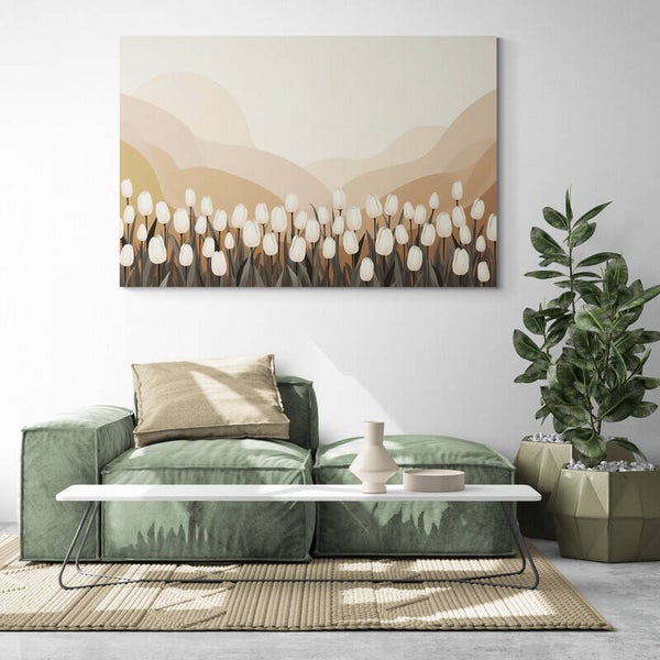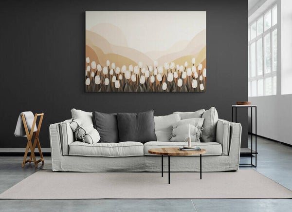 Een rustgevend kunstwerk waarin witte tulpen elegant opkomen uit een warm bruin landschap. De achtergrond bestaat uit vloeiende golven in zandtinten met een subtiele, gladde structuur die doet denken aan zachte kleilagen. Deze compositie voelt kalm en verfijnd aan en past perfect in natuurlijke en moderne interieurs.